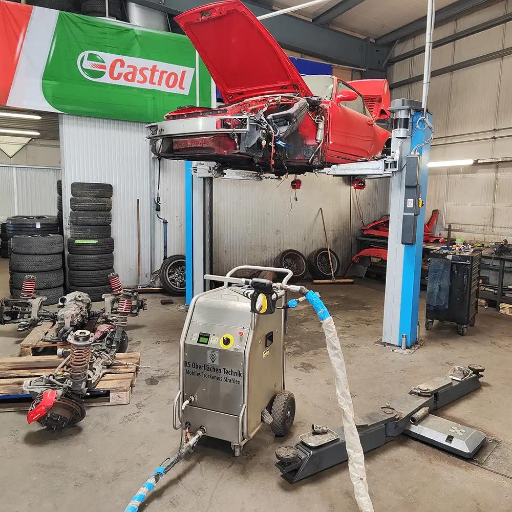 In der Kfz-Werkstatt säubere ich mithilfe von Trockeneisstrahlen